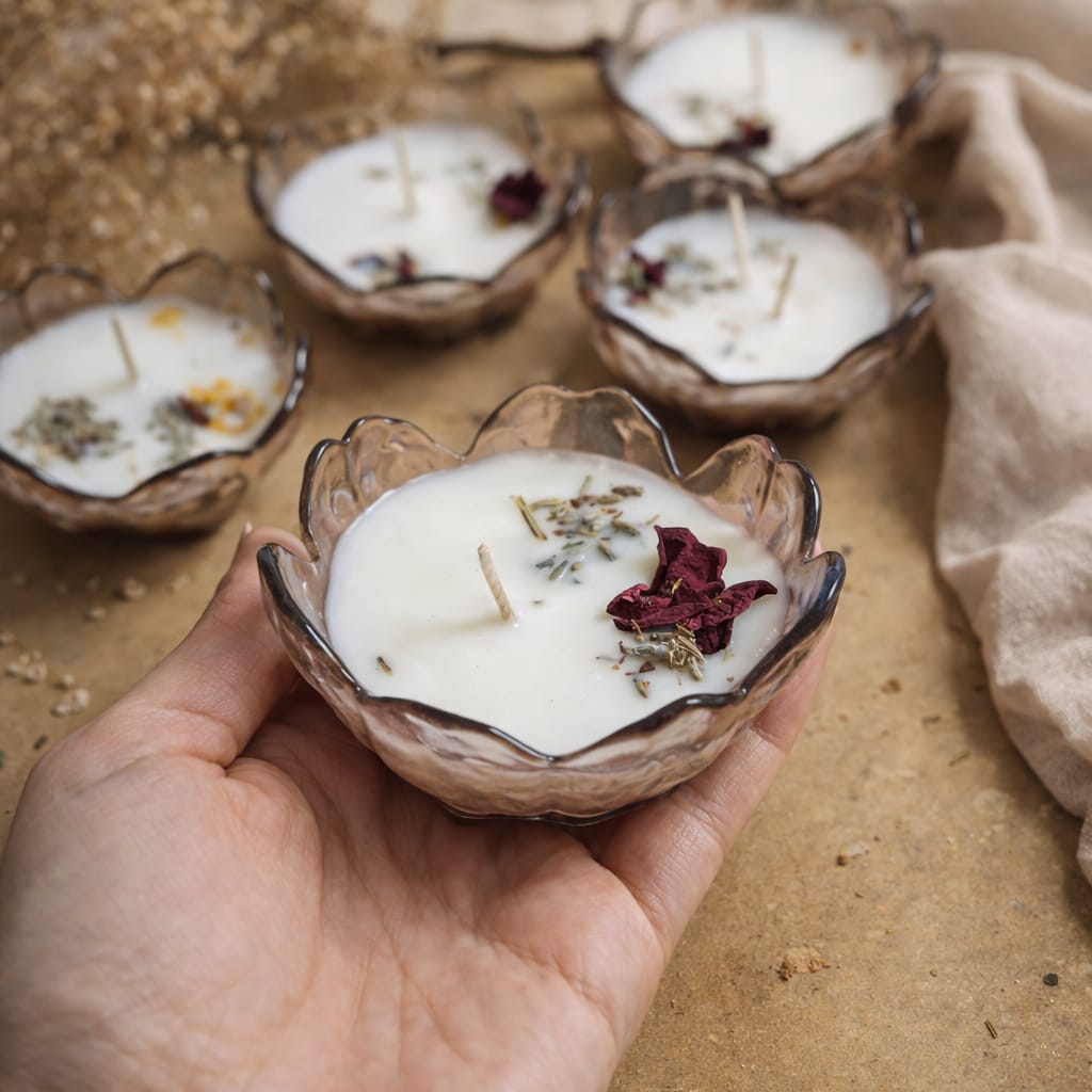 Experience the warmth and charm of our homemade Velarte candles, crafted from natural ingredients in a pink flower glass container. Each candle features: